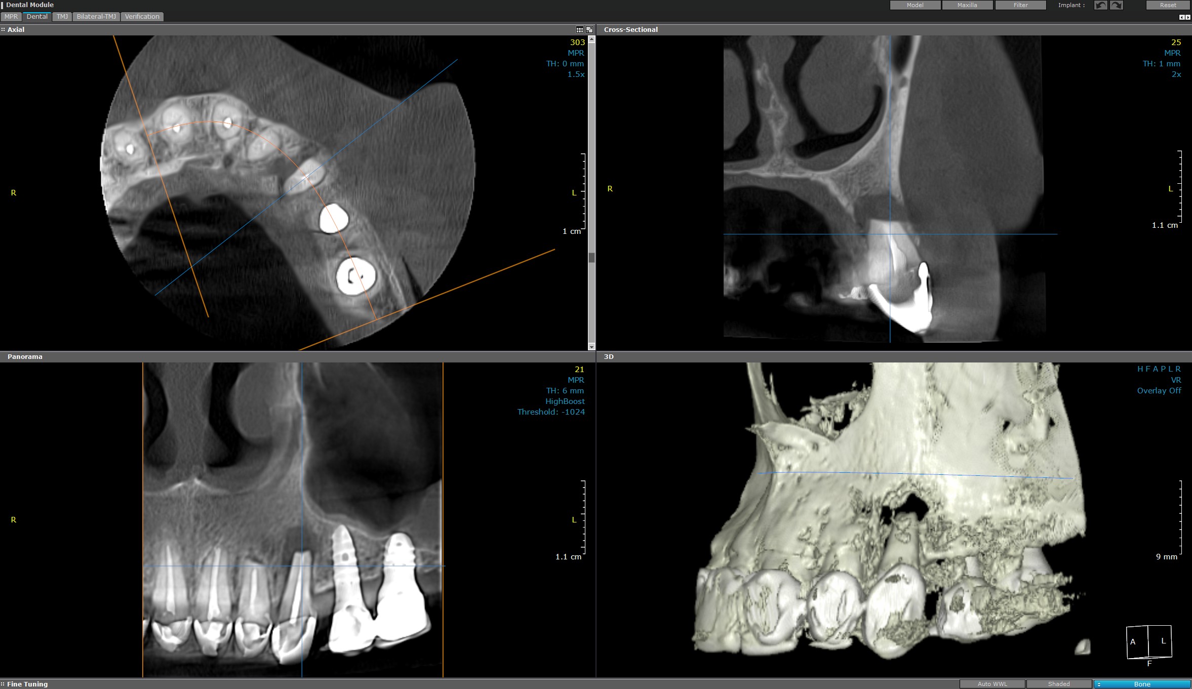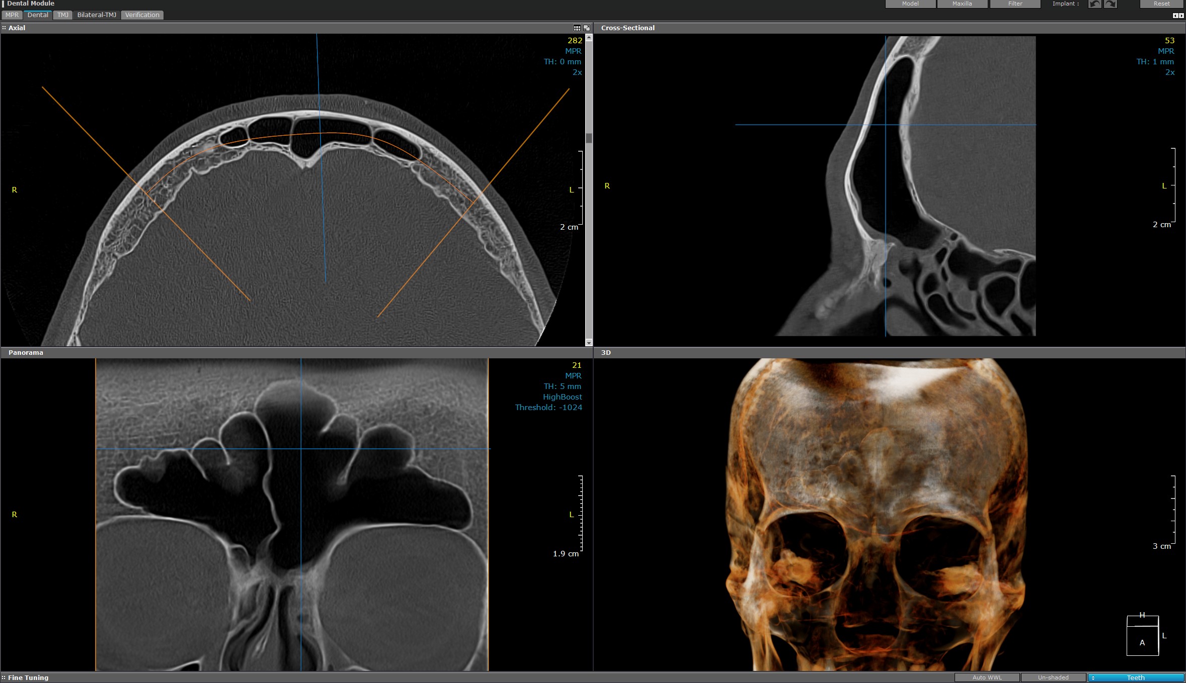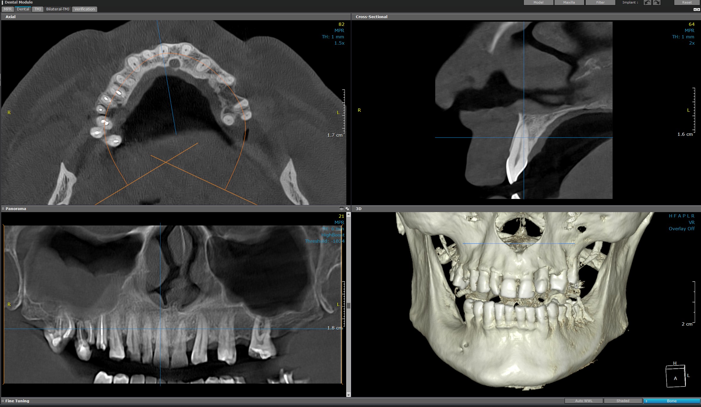 Aceasta este utilizată la evaluarea preoperatorie a osului maxilar, planificarea implanturilor dentare și la stabilirea densității osoase, detectarea fracturilor, tumorilor, a infecțiilor și raportului acestora cu structurile anatomice învecinate acestora