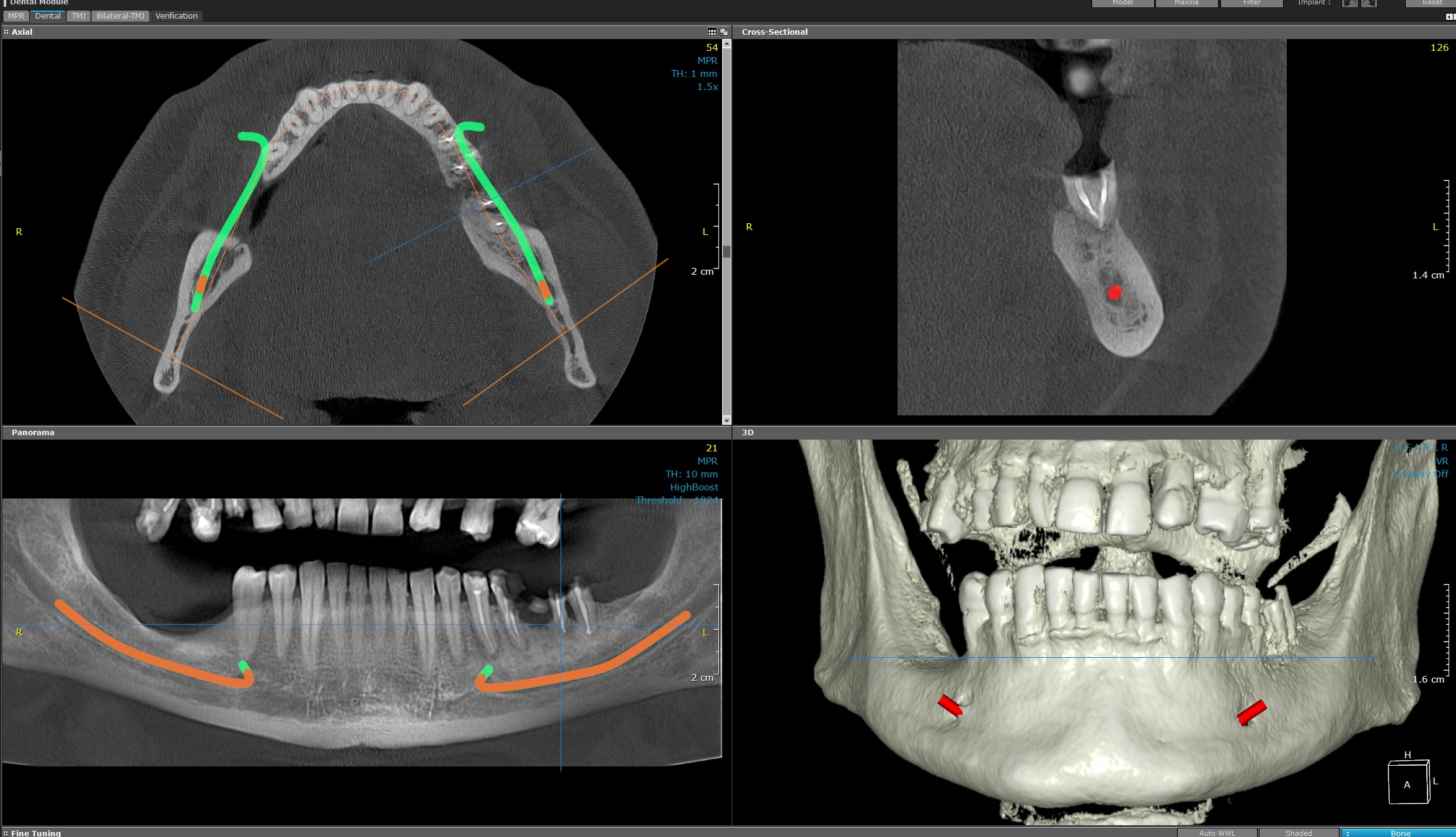 Se determină volumul și structura osului disponibil pentru a simula cu acuratețe plasarea implanturilor dentare. - Măsurători pe zone de interes
